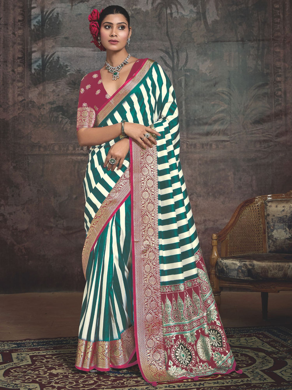 Color - Saree: Green, Blouse: Red
