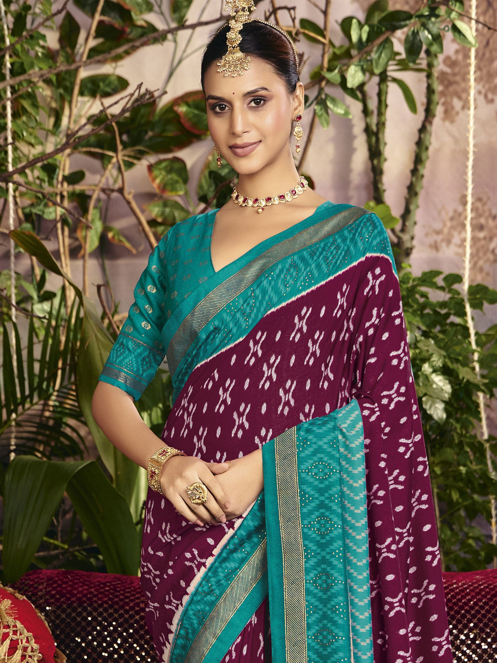 Color - Saree: Wine, Blouse: Turquoise