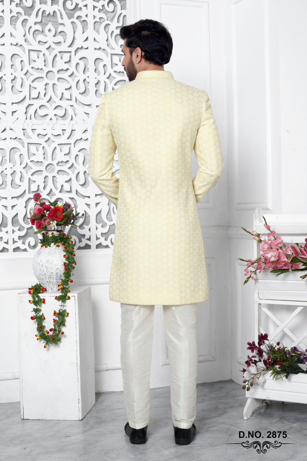 Yellow Jacquard Woven Indo Sherwani